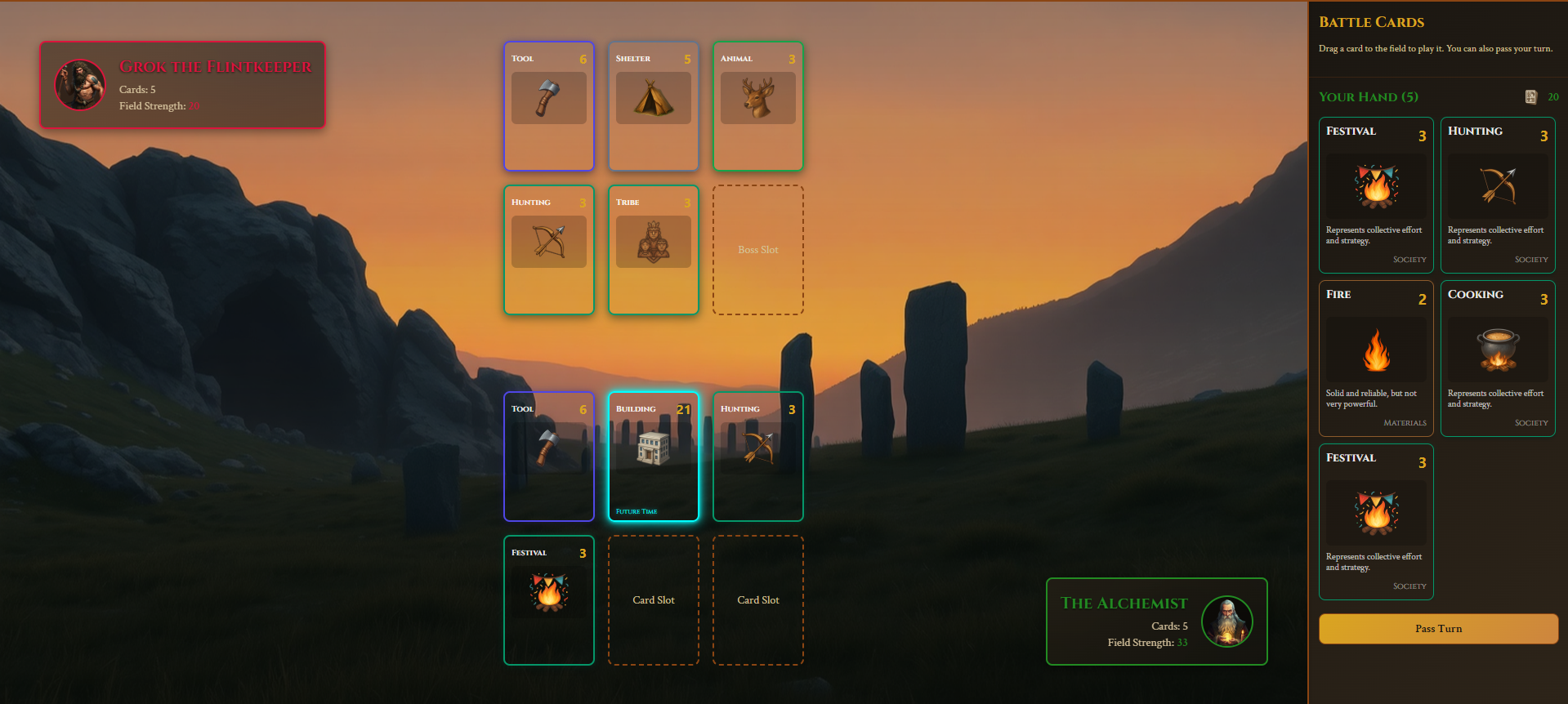 - Strategic Card Battles: A deep yet accessible card game mechanic where you play and combine your discoveries on the battlefield to overwhelm your opponent.